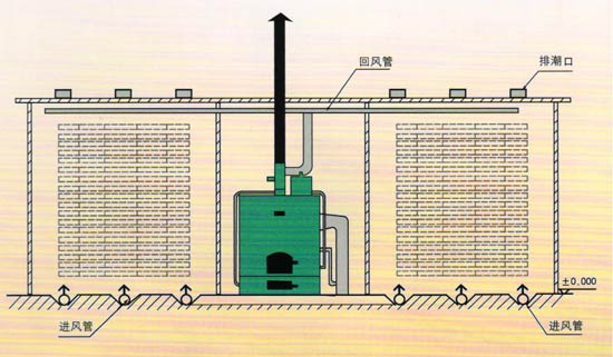熱風式干燥設備工作原理是利用燃燒產生的熱能,加熱窯內的空氣,由熱風爐頂部主風機將窯內的空氣通過管道吸入爐體,將空氣加熱。再通過管道,送入窯內,由窯內的循環風機不斷的循環對窯內的木材均勻加熱。木材干燥過程中如需要蒸汽,可由熱風爐內的蒸汽發生器提供,如果是一爐兩房或多房時,管道上裝有插閥,通過插閥的調節來控制窯內的溫度。在干燥的過程中,由于木材要進行排濕,在窯頂上留有排濕孔(根據地區而定)和裝有抽濕機,用來調節排濕的快慢.